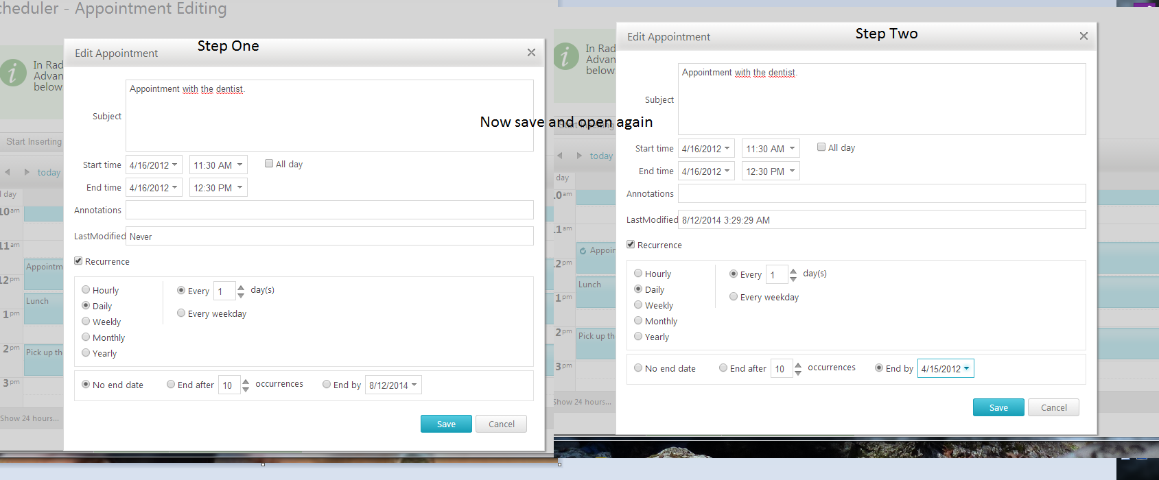 4. I would like to clarify that in general the recurrence rule is generated by creating an appointment. In order to have a recurrence rule which has an end date before the start date you first need to create such appointment. The RadScheduler advanced form offer in-built validation that prevents creating an appointment with end date before the start date. You can test this validation with our RadScheduler demos.