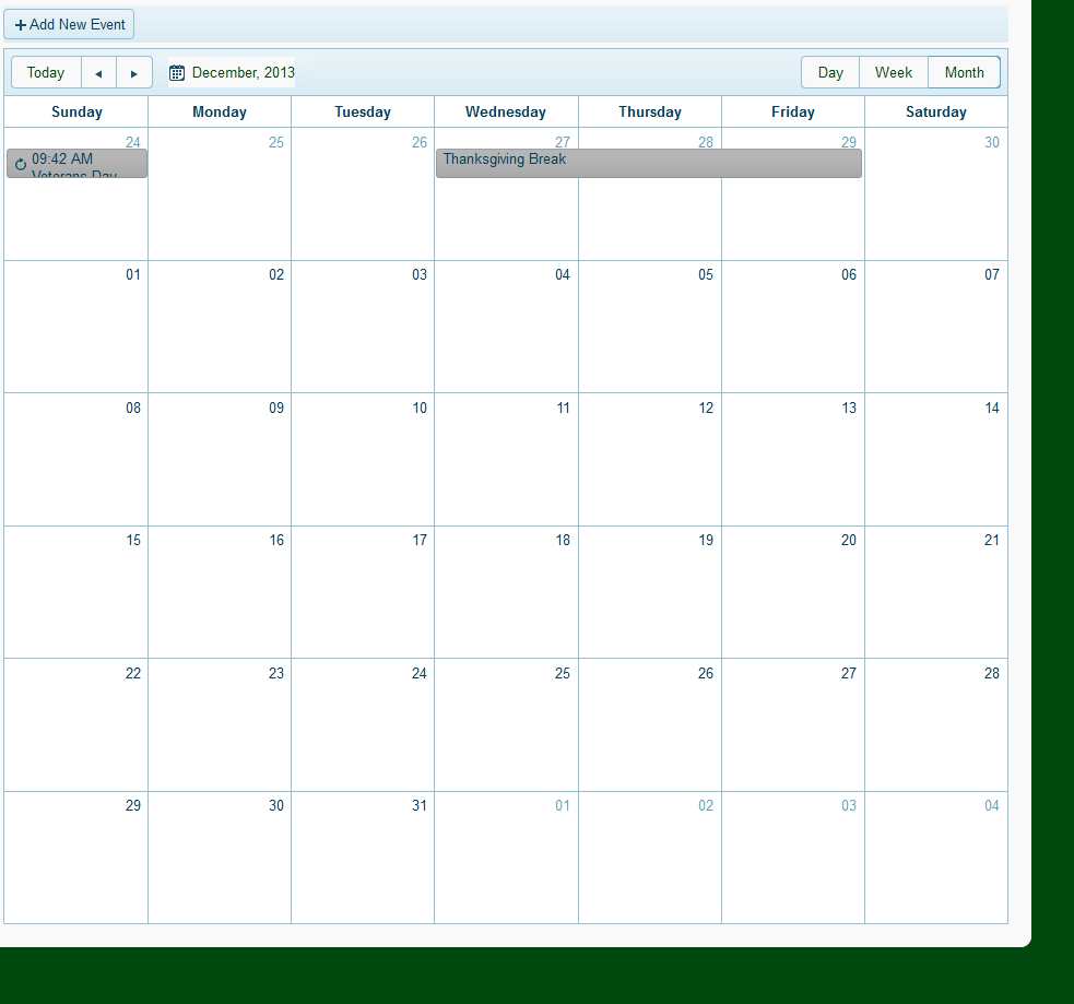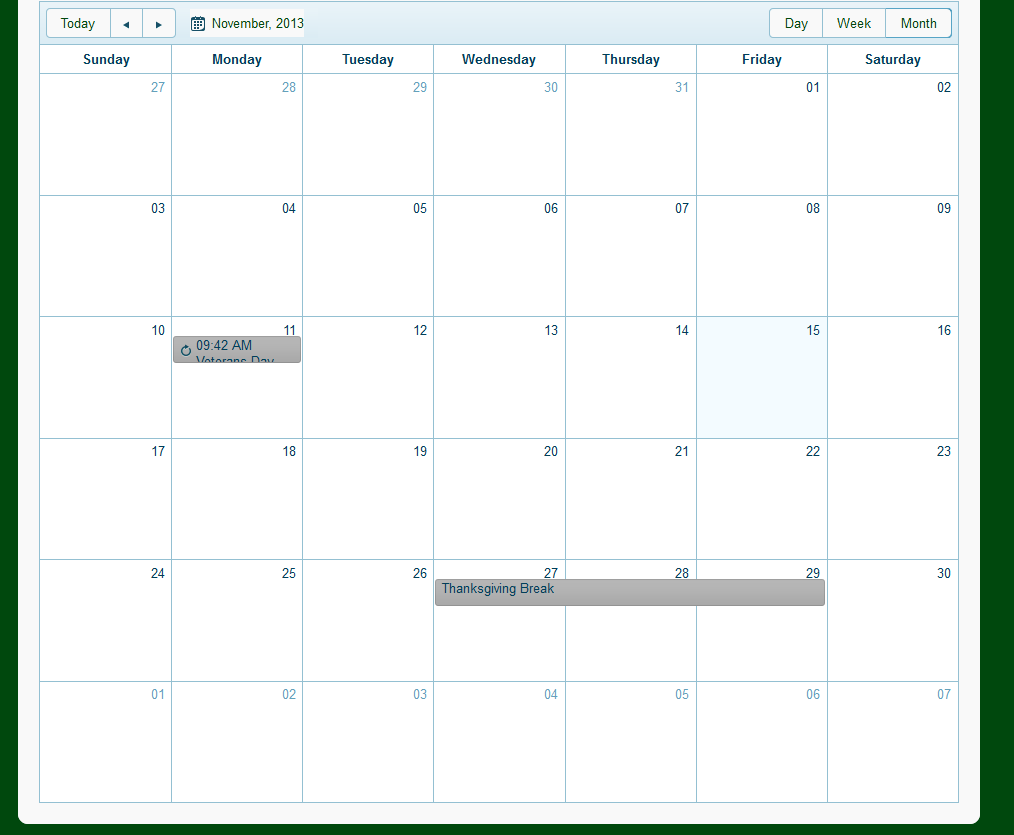 etc, it renders the first rule correct, when I change the month to the next month (december) I see that veterans day has magically moved from its normal spot to now rest on the last week of november. if I go back to november it shows it on the right day again, but moving forward will still move it to the first spot on the calendar (which usually seems to correspond to the last week of the previous month)