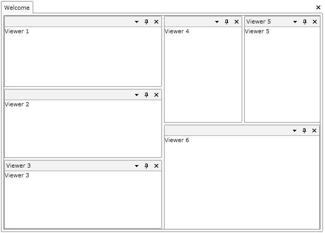 <telerik:RadDocking Grid.Row="1" x:Name="radDocking" Background="White"> <telerik:RadDocking.DocumentHost> <telerik:RadPaneGroup TabStripPlacement="Top" x:Name="radPaneGroup" > <telerik:RadDocumentPane Header="Welcome"> <telerik:RadSplitContainer> <telerik:RadSplitContainer Orientation="Vertical"> <telerik:RadPaneGroup x:Name="rpgGrid" > <telerik:RadPane> <TextBlock>Viewer 1</TextBlock> </telerik:RadPane> </telerik:RadPaneGroup> <telerik:RadPaneGroup > <telerik:RadPane> <TextBlock>Viewer 2</TextBlock> </telerik:RadPane> </telerik:RadPaneGroup> <telerik:RadPaneGroup > <telerik:RadPane Title="Viewer 3"> <TextBlock>Viewer 3</TextBlock> </telerik:RadPane> </telerik:RadPaneGroup> </telerik:RadSplitContainer> <telerik:RadSplitContainer Orientation="Vertical" InitialPosition="DockedLeft"> <telerik:RadSplitContainer Orientation="Horizontal"> <telerik:RadPaneGroup > <telerik:RadPane> <TextBlock>Viewer 4</TextBlock> </telerik:RadPane> </telerik:RadPaneGroup> <telerik:RadPaneGroup > <telerik:RadPane Title="Viewer 5"> <TextBlock>Viewer 5</TextBlock> </telerik:RadPane> </telerik:RadPaneGroup> </telerik:RadSplitContainer> <telerik:RadPaneGroup > <telerik:RadPane> <TextBlock>Viewer 6</TextBlock> </telerik:RadPane> </telerik:RadPaneGroup> </telerik:RadSplitContainer> </telerik:RadSplitContainer> </telerik:RadDocumentPane> </telerik:RadPaneGroup> </telerik:RadDocking.DocumentHost></telerik:RadDocking>