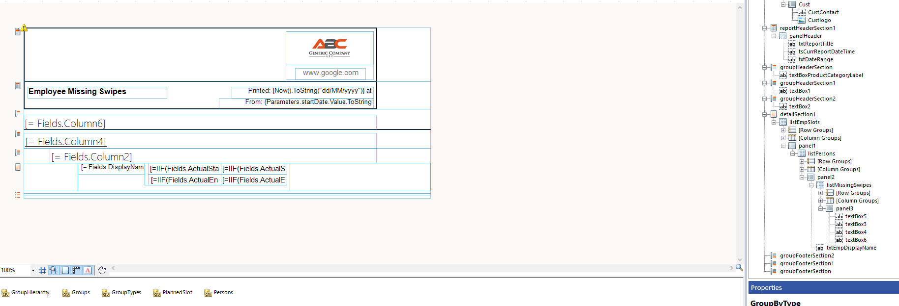 I have a report that's supposed to show a list of employees who haven't swiped in or out, and which swipe they missed. I'm having trouble getting it working the way I need it to work, so I'm hoping someone can help me out. I can't seem to attach the report file here, so I've attached some screenshots.