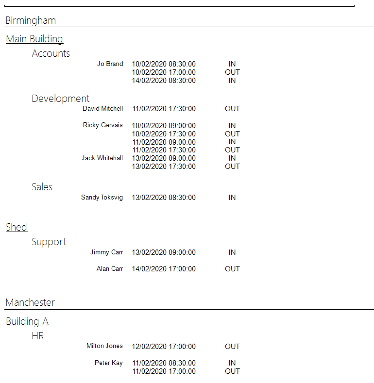 The report will be organised in a group hierarchy, but the groups themselves won't be specified in the report. In the attached sample report they're grouped by Location, Building, and Department, which for this example have been specified manually in the GroupTypes and GroupHierarchy CSV sources, but different companies might have different group hierarchies. For example they might only have 'Location' and 'Department', or they could have several other groups. Essentially the report should be able to handle any group hierarchy without needing to update the report manually. I've seen people saying they solved this by using recursive sub-reports, but so far I haven't been able to get this working.