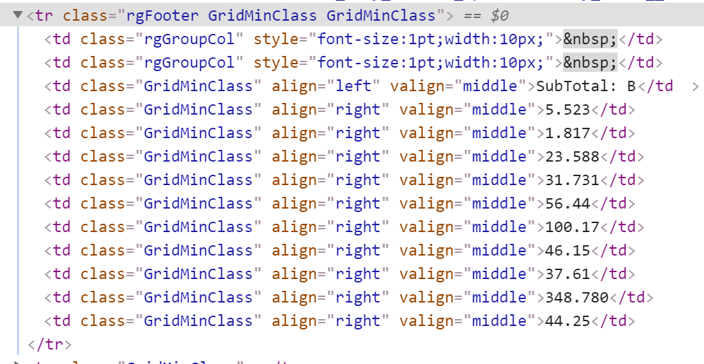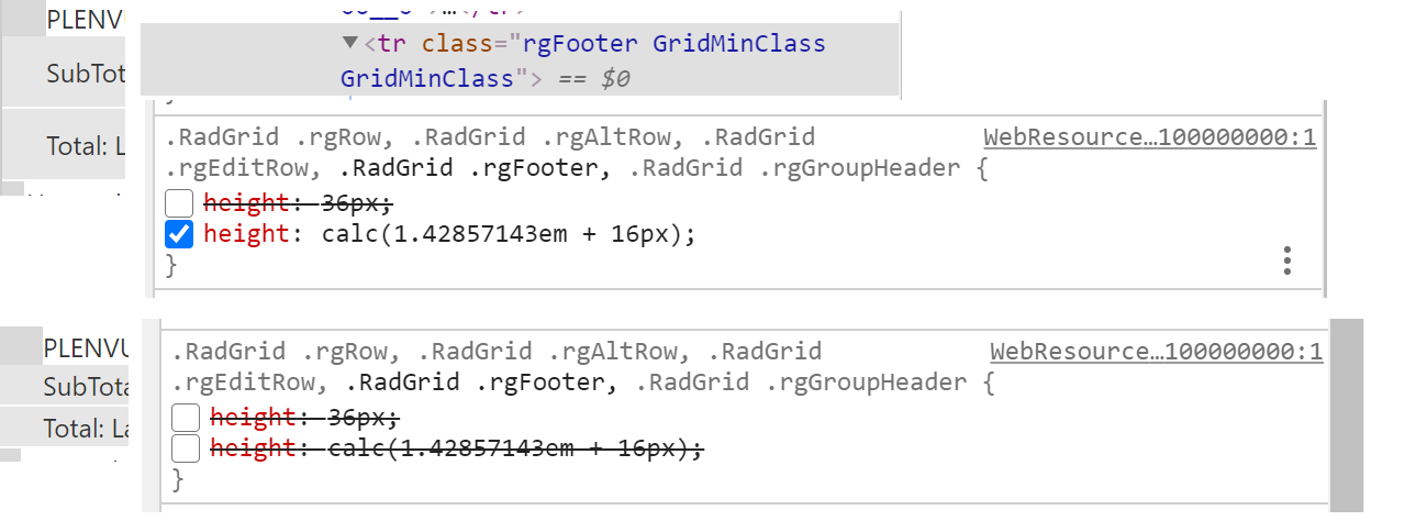 protected void RadGrid_Summary_ColumnCreated(object sender, GridColumnCreatedEventArgs e) { if (e.Column is GridGroupSplitterColumn c) { c.HeaderStyle.Width = Unit.Pixel(10); c.HeaderStyle.Font.Size = FontUnit.Point(1); c.FooterStyle.Width = Unit.Pixel(10); c.FooterStyle.Font.Size = FontUnit.Point(1); c.ItemStyle.Width = Unit.Pixel(10); c.ItemStyle.Font.Size = FontUnit.Point(1); c.Resizable = false; } } protected void RadGrid_Summary_ItemCreated(object sender, GridItemEventArgs e) { if (e.Item is GridGroupHeaderItem headerItem) { headerItem.CssClass = "GridMinClass"; if (headerItem.Cells.Count > 1 && headerItem.Cells[1].Controls.Count > 0 && headerItem.Cells[1].Controls[0] is Button headerButton1) { headerButton1.Visible = false; headerButton1.Height = Unit.Pixel(0); } if (headerItem.Cells.Count > 0 && headerItem.Cells[0].Controls.Count > 0 && headerItem.Cells[0].Controls[0] is Button headerButton2) { headerButton2.Visible = false; headerButton2.Height = Unit.Pixel(0); } } if (e.Item is GridGroupFooterItem footerItem) { footerItem.CssClass = "GridMinClass"; } if (e.Item is GridDataItem dataItem) { dataItem.CssClass = "GridMinClass"; } } gridmin.css:.GridMinClass { padding: 0; padding-left: 0; padding-right: 0; padding-top: 0; padding-bottom: 0;}