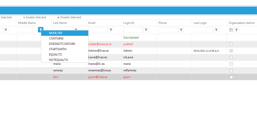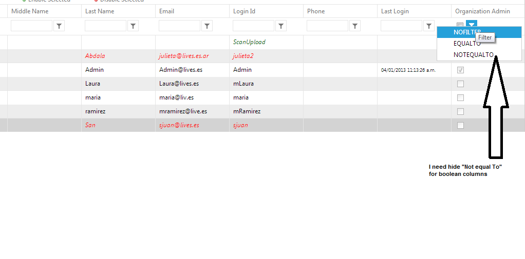 See the last columns (Organization Admin) there i need 2 options only (not filter and equal to)