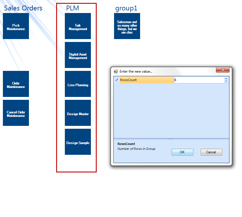 I have allowed my user to change the number of Rows in a Group residing in a Panorama via a form with a Property Grid (see image 5_Rows.png). After this value has changed, and the property is updated, all of the existing tiles are pushed together (see image 6_RowsSaved.png). The only thing that fixes this is if I change the size of the Panorama (which is a child control of a split panel - I am actually just moving the splitter and the tiles seem to refresh after that).