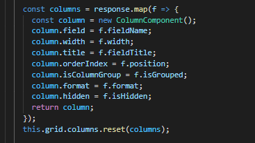 Grid is initialized on page load with data source 1, data source 1 has columns A, B, C, D. Grid correctly shows columns ABCD. The user now wants to view a different data set by selecting a series of drop downs on the page. Updating the data source to data source 2 with columns B, D, E, F. The grid now incorrectly shows columns ABCD.