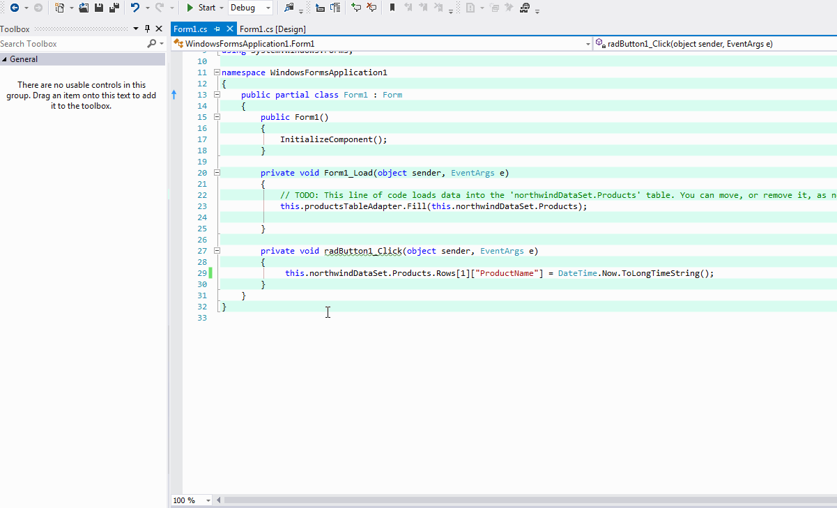My radGridView gets it's data using a DataSet, BindingSOurce, and a TableAdaptor.