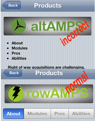 I'm working on our mobile app, and right now I have a list view of all of our products. When you click on each product, it takes you to a new view/html file with all the product information. Each product has 3/4 tabs. It works great when you go to the first product, but when you go to the second, it displays just a bulleted list instead of the tabs. If you hit refresh on the page it displays them correctly, but when you hit back, then on a new product, it does it again. I've attached images of the normal and incorrect views. Any suggestions? Or ways to automatically refresh the page when it loads to avoid this?