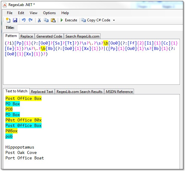 <td>@Html.TextBoxFor(model => model.cAddress1_Line1, new { @tabindex = 100, @id = "cAddress1_Line1", @class = "k-textbox", placeholder = "physical address - line 1", @maxlength = "50", @style = "font-size:small; width:90%;" })</td>Now, for the regular expression, the results I see in