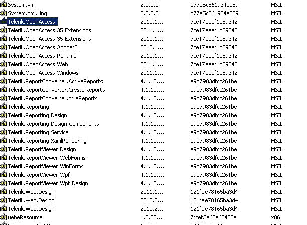 public static List<User> ListUser(ORMNewVersionModel context) { IQueryable<User> listUser; listUser = (from usr in context.Users select usr ); return listUser.ToList(); }Also my GAC as the assemblies displayed in the image i'm sending to you. For the propose of this thread I took the liberty to create a simple project, and latter on I will create a support ticket, but in the meantime i am getting yet another error, which after a brief search pointed me to another common error when having outdated references the message says "Unable to cast object of type 'Telerik.OpenAccess.RT.Adonet2Generic.Impl.DBDriver' to type 'Telerik.OpenAccess.RT.sql.Driver'."
