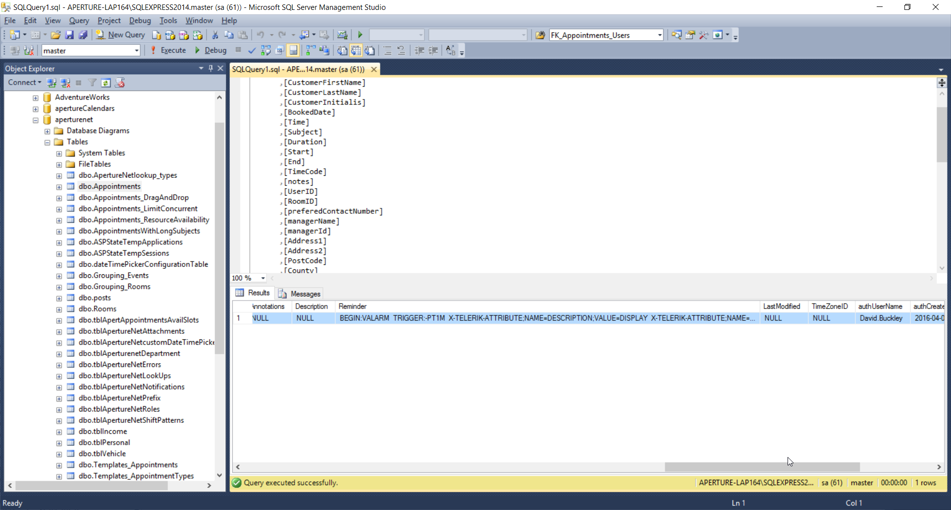 01.<asp:UpdatePanel ID="UpdatePanel1" runat="server">02. <ContentTemplate>03. <div>04. <legend>Calendar Layout</legend>05. <asp:RadioButtonList ID="rbDisplay" CellSpacing="5" AutoPostBack="true" RepeatDirection="Horizontal" runat="server">06. <asp:ListItem Value="1"> Verticle </asp:ListItem>07. <asp:ListItem Value="2"> Horizontal </asp:ListItem>08. </asp:RadioButtonList>09. </div>10. <telerik:RadScheduler OnTimeSlotCreated="apertureAppointments_TimeSlotCreated" OverflowBehavior="Auto" runat="server" WeekView-ShowDateHeaders="true" ID="apertureAppointments"11. TimelineView-UserSelectable="false" DayView-UserSelectable="true" AgendaView-UserSelectable="True" DataKeyField="ID" DataSubjectField="Subject" AllowInsert="false" AllowDelete="false" AllowEdit="false"12. DataStartField="Start" DataEndField="End" DataRecurrenceField="RecurrenceRule" DayView-EnableExactTimeRendering="true" WeekView-UserSelectable="True" SelectedView="WeekView"13. DataRecurrenceParentKeyField="RecurrenceParentID" DataSourceID="EntityDataSource1" StartInsertingInAdvancedForm="True" MonthView-UserSelectable="True" AgendaView-NumberOfDays="5" RowHeight="40px"14. RenderMode="Classic" EnableExactTimeRendering="True" Reminders-Enabled="true" Width="800px" Height="1000px" EnableDatePicker="true" ShowHeader="true"15. DayStartTime="09:00:00" ShowFooter="false" DayEndTime="18:00" FirstDayOfWeek="Monday" LastDayOfWeek="Friday" HoursPanelTimeFormat="HH:mm tt" OnAppointmentClick="apertureAppointments_AppointmentClick" OnTimeSlotContextMenuItemClicking="apertureAppointments_TimeSlotContextMenuItemClicking"16. EnableDescriptionField="true" AppointmentStyleMode="Default" Skin="Metro">17. 18. <AdvancedForm Modal="True" />19. 20. <TimeSlotContextMenuSettings EnableDefault="false" />21. <AppointmentContextMenuSettings EnableDefault="false" />22. <DayView EnableExactTimeRendering="True" />23. <AdvancedForm Modal="true"></AdvancedForm>24. 25. <ResourceTypes>26. <telerik:ResourceType KeyField="lookup_code" Name="Managers" TextField="lookup_description" ForeignKeyField="managerId"27. DataSourceID="ManagersDataSource"></telerik:ResourceType>28. </ResourceTypes>29. <ResourceStyles>30. <%--AppointmentStyleMode must be explicitly set to Default (see above) otherwise setting BackColor/BorderColor31. will switch the appointments to Simple rendering (no rounded corners and gradients)--%>32. <telerik:ResourceStyleMapping Type="Managers" Text="Natalie Edgar"33. BackColor="#512479" ApplyCssClass="appointment" />34. <telerik:ResourceStyleMapping Type="Managers" Text="Clare Coyle"35. BackColor="#512479" ApplyCssClass="appointment" />36. <telerik:ResourceStyleMapping Type="Managers" Text="Christine Clarke"37. BackColor="#512479" ApplyCssClass="appointment" />38. <telerik:ResourceStyleMapping Type="Managers" Text="Adam Adair"39. BackColor="#512479" ApplyCssClass="appointment" />40. </ResourceStyles>41. </telerik:RadScheduler>42. </ContentTemplate>43. </asp:UpdatePanel>44. 45. <asp:EntityDataSource runat="server" ID="EntityDataSource1" ConnectionString="name=aperturenetEntities"46. DefaultContainerName="aperturenetEntities" EntitySetName="Appointments" EnableDelete="true"47. EnableInsert="true" EnableUpdate="true">48. </asp:EntityDataSource>49. 50. <asp:SqlDataSource ID="RoomsDataSource" runat="server"51. ProviderName="System.Data.SqlClient" ConnectionString="<%$ ConnectionStrings:aperturenetSql %>"52. SelectCommand="SELECT * FROM [Rooms]"></asp:SqlDataSource>53. 54. <asp:SqlDataSource ID="ManagersDataSource" runat="server"55. ConnectionString="<%$ ConnectionStrings:aperturenetSql %>" SelectCommand="SELECT * FROM [tblApertureNetLookUps] WHERE lookup_type='11787CA6-DE99-4E0E-83D2-7D96E0FD11A3'"></asp:SqlDataSource>