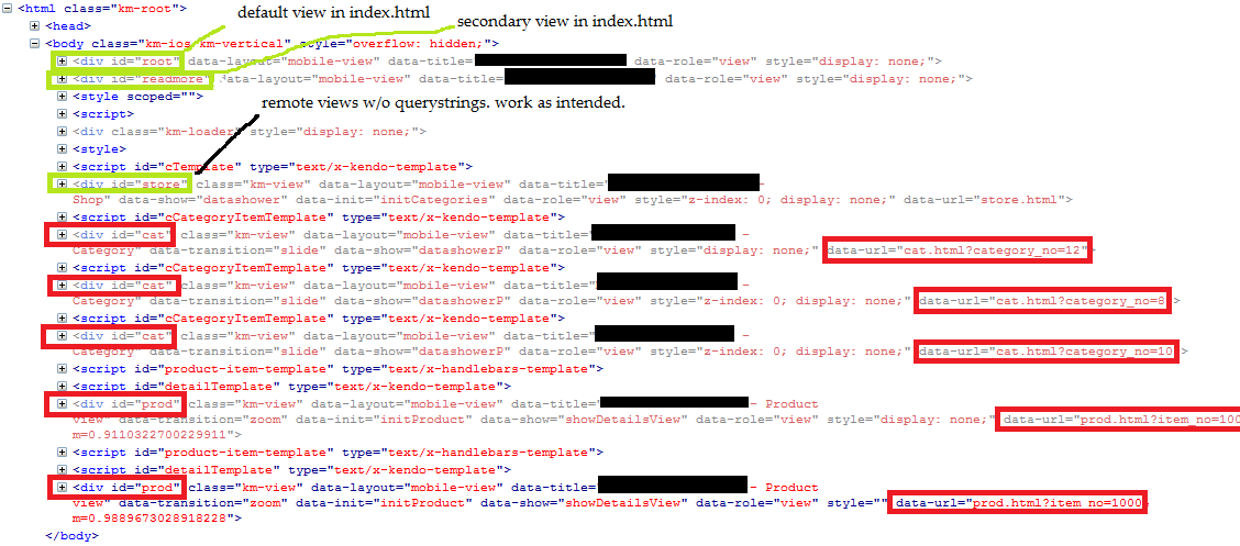 A remote view is normally just added once, and re-used. I see the point of that. Until it has querystrings - then each unique permutation is added as a DOM element (due to mismatching data-url?) , leading to massive problems. Not only in things not properly working ( i.e. trying to $("#elem").kendoMobileListView( ) will / may fail, or populate a listview in a completely different, hidden, view) but it also leads to unnecessary memory usage, and general browser slowness. Depending on the complexity of the views, naturally.