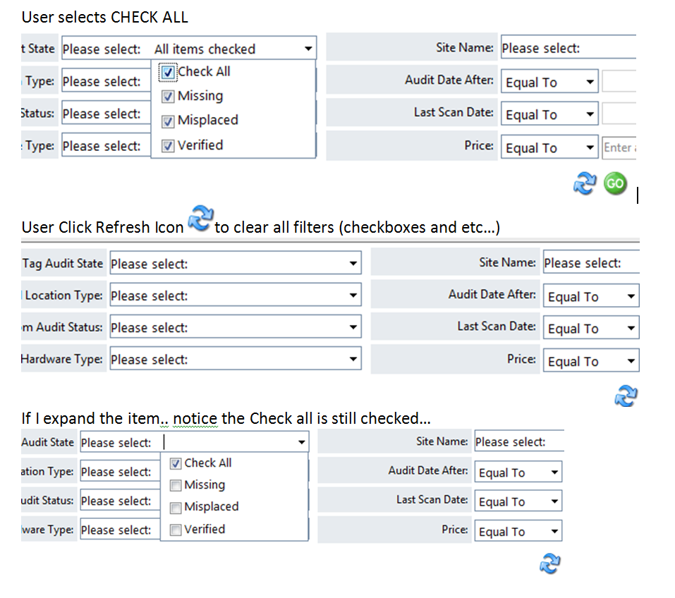 1. In a RadComboBox (with a empty message Please select: ) are several checkbox options, plus a check all...