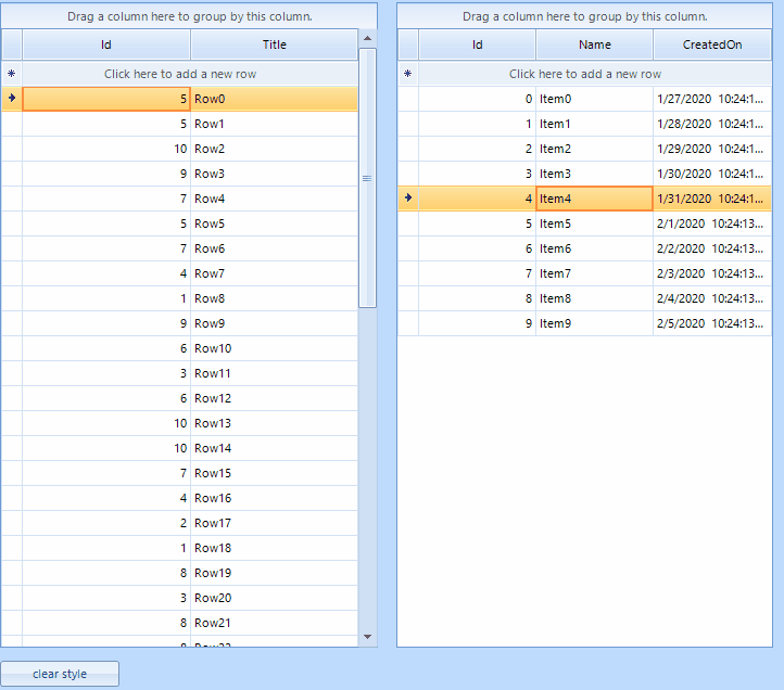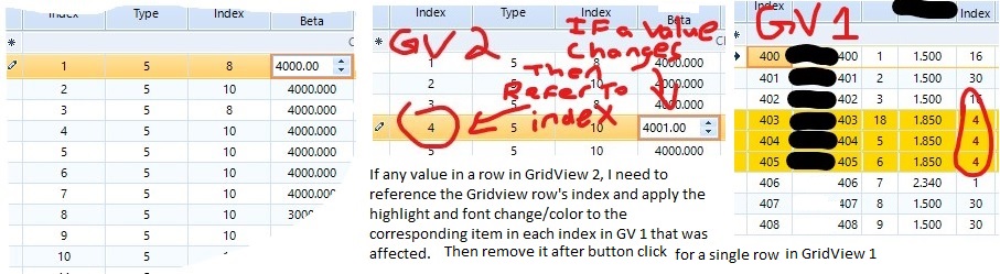 I have a grid-view with multiple grids working together, and one of the tasks at hand is if a value changes in a cell in one grid, then the main grid has to highlight any objects that shared that data that were affected by the change. The customer then needs to compile that data and at that point, the row for that object needs to have the highlight removed. I am able to get the conditional formatting for the highlight to work, but removing it from the entire row after the button click is proving to be a challenge. currently my code is set to do this using the following: