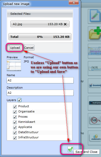 But along with uploading a file, we are also some other properties of that file, so we have proivided another button to "Upload and save". Please find here the attached screen shot of UI.