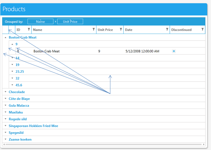 <telerik:RadGridView.Resources><BR> <Style x:Key="GridViewGroupRowStyle1" TargetType="{x:Type telerik:GridViewGroupRow}"><BR> <Setter Property="Template"><BR> <Setter.Value><BR> <ControlTemplate TargetType="{x:Type telerik:GridViewGroupRow}"><BR> <Grid x:Name="PART_GroupExpanderGrid"><BR> <Grid.ColumnDefinitions><BR> <ColumnDefinition Width="Auto"/><BR> <ColumnDefinition Width="Auto"/><BR> <ColumnDefinition Width="*"/><BR> </Grid.ColumnDefinitions><BR> <Grid.RowDefinitions><BR> <RowDefinition x:Name="PART_HeaderRow" MinHeight="{TemplateBinding MinHeight}"/><BR> <RowDefinition x:Name="ContentRow" Height="Auto"/><BR> </Grid.RowDefinitions><BR> <VisualStateManager.VisualStateGroups><BR> <VisualStateGroup x:Name="ExpandStateGroup"><BR> <VisualState x:Name="Expanded"><BR> <Storyboard><BR> <ObjectAnimationUsingKeyFrames Storyboard.TargetProperty="Visibility"Storyboard.TargetName="Content"><BR> <DiscreteObjectKeyFrame KeyTime="0"><BR> <DiscreteObjectKeyFrame.Value><BR> <Visibility>Visible</Visibility><BR> </DiscreteObjectKeyFrame.Value><BR> </DiscreteObjectKeyFrame><BR> </ObjectAnimationUsingKeyFrames><BR> <ObjectAnimationUsingKeyFrames Storyboard.TargetProperty="Visibility"Storyboard.TargetName="BottomBorder"><BR> <DiscreteObjectKeyFrame KeyTime="0"><BR> <DiscreteObjectKeyFrame.Value><BR> <Visibility>Visible</Visibility><BR> </DiscreteObjectKeyFrame.Value><BR> </DiscreteObjectKeyFrame><BR> </ObjectAnimationUsingKeyFrames><BR> <ObjectAnimationUsingKeyFrames Storyboard.TargetProperty="BorderThickness"Storyboard.TargetName="IconOuterBorder"><BR> <DiscreteObjectKeyFrame KeyTime="0"><BR> <DiscreteObjectKeyFrame.Value><BR> <Thickness>0</Thickness><BR> </DiscreteObjectKeyFrame.Value><BR> </DiscreteObjectKeyFrame><BR> </ObjectAnimationUsingKeyFrames><BR> <ObjectAnimationUsingKeyFrames Storyboard.TargetProperty="BorderThickness"Storyboard.TargetName="IconInnerBorder"><BR> <DiscreteObjectKeyFrame KeyTime="0"><BR> <DiscreteObjectKeyFrame.Value><BR> <Thickness>1,1,0,0</Thickness><BR> </DiscreteObjectKeyFrame.Value><BR> </DiscreteObjectKeyFrame><BR> </ObjectAnimationUsingKeyFrames><BR> <DoubleAnimationUsingKeyFrames BeginTime="0"Storyboard.TargetProperty="(UIElement.RenderTransform).(RotateTransform.Angle)"Storyboard.TargetName="ExpanderButton"><BR> <EasingDoubleKeyFrame KeyTime="0:0:0.2" Value="180"/><BR> </DoubleAnimationUsingKeyFrames><BR> </Storyboard><BR> </VisualState><BR> <VisualState x:Name="Collapsed"><BR> <Storyboard><BR> <DoubleAnimationUsingKeyFrames BeginTime="0"Storyboard.TargetProperty="(UIElement.RenderTransform).(RotateTransform.Angle)"Storyboard.TargetName="ExpanderButton"><BR> <EasingDoubleKeyFrame KeyTime="0:0:0.2" Value="0"/><BR> </DoubleAnimationUsingKeyFrames><BR> </Storyboard><BR> </VisualState><BR> </VisualStateGroup><BR> </VisualStateManager.VisualStateGroups><BR> <Border x:Name="ToggleButtonBorder" Background="{TemplateBinding Background}"Grid.ColumnSpan="2" Grid.Column="2" MinHeight="{TemplateBinding MinHeight}"telerik:SelectiveScrollingGrid.SelectiveScrollingClip="True"><BR> <Grid><BR> <Grid.ColumnDefinitions><BR> <ColumnDefinition Width="25"/><BR> <ColumnDefinition Width="Auto"/><BR> <ColumnDefinition Width="*"/><BR> </Grid.ColumnDefinitions><BR> <Border Grid.Column="2" HorizontalAlignment="{TemplateBinding HorizontalContentAlignment}" telerik:SelectiveScrollingGrid.SelectiveScrollingClip="True"VerticalAlignment="{TemplateBinding VerticalContentAlignment}"><BR> <Border.Visibility><BR> <Binding Path="ShowHeaderAggregates" RelativeSource="{RelativeSource TemplatedParent}"><BR> <Binding.Converter><BR> <telerik:BooleanToVisibilityConverter/><BR> </Binding.Converter><BR> </Binding><BR> </Border.Visibility><BR> <telerik:AggregateResultsList HorizontalAlignment="{TemplateBinding HorizontalContentAlignment}" IsTabStop="False"VerticalAlignment="{TemplateBinding VerticalContentAlignment}"><BR> <telerik:AggregateResultsList.ItemsPanel><BR> <ItemsPanelTemplate><BR> <StackPanel IsItemsHost="True" Orientation="Horizontal"/><BR> </ItemsPanelTemplate><BR> </telerik:AggregateResultsList.ItemsPanel><BR> <telerik:AggregateResultsList.ItemTemplate><BR> <DataTemplate><BR> <telerik:GridViewAggregateResultCell AggregateResult="{Binding}"IsTabStop="False"><BR> <telerik:StyleManager.Theme><BR> <telerik:Office_BlackTheme/><BR> </telerik:StyleManager.Theme><BR> </telerik:GridViewAggregateResultCell><BR> </DataTemplate><BR> </telerik:AggregateResultsList.ItemTemplate><BR> </telerik:AggregateResultsList><BR> </Border><BR> <Border x:Name="IconOuterBorder" BorderBrush="#FF848484"BorderThickness="0,0,0,1" Background="Transparent" HorizontalAlignment="Stretch"telerik:SelectiveScrollingGrid.SelectiveScrollingOrientation="Vertical"><BR> <Border x:Name="IconInnerBorder" BorderBrush="White"BorderThickness="1,1,0,1"><BR> <Path x:Name="ExpanderButton" Grid.Column="0" Data="M0,0L1,0 2,0 2,0.99999991 3,0.99999991 3,2 4,2 4,0.99999991 5,0.99999991 5,0 5.9999999,0 7,0 7,0.99999991 5.9999999,0.99999991 5.9999999,2 5,2 5,3 4,3 4,4 3,4 3,3 2,3 2,2 1,2 1,0.99999991 0,0.99999991z" Fill="Black" HorizontalAlignment="Left" Height="5"Margin="{TemplateBinding Padding}" RenderTransformOrigin="0.5,0.5"VerticalAlignment="{TemplateBinding VerticalContentAlignment}" Width="7"><BR> <Path.RenderTransform><BR> <RotateTransform/><BR> </Path.RenderTransform><BR> </Path><BR> </Border><BR> </Border><BR> <ToggleButton x:Name="HeaderButton" Background="{TemplateBinding Background}"Grid.ColumnSpan="3" Grid.Column="0" IsTabStop="{TemplateBinding IsTabStop}"IsChecked="{Binding IsExpanded, Mode=TwoWay, RelativeSource={RelativeSource TemplatedParent}}" Opacity="0"telerik:SelectiveScrollingGrid.SelectiveScrollingOrientation="Vertical"/><BR> <ToggleButton BorderBrush="{x:Null}" BorderThickness="0"Background="Transparent" Grid.Column="1" IsTabStop="{TemplateBinding IsTabStop}"IsChecked="{Binding IsExpanded, Mode=TwoWay, RelativeSource={RelativeSource TemplatedParent}}" Padding="0,0,10,0"telerik:SelectiveScrollingGrid.SelectiveScrollingOrientation="Ve