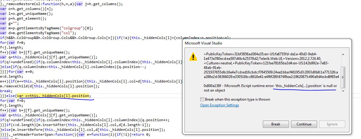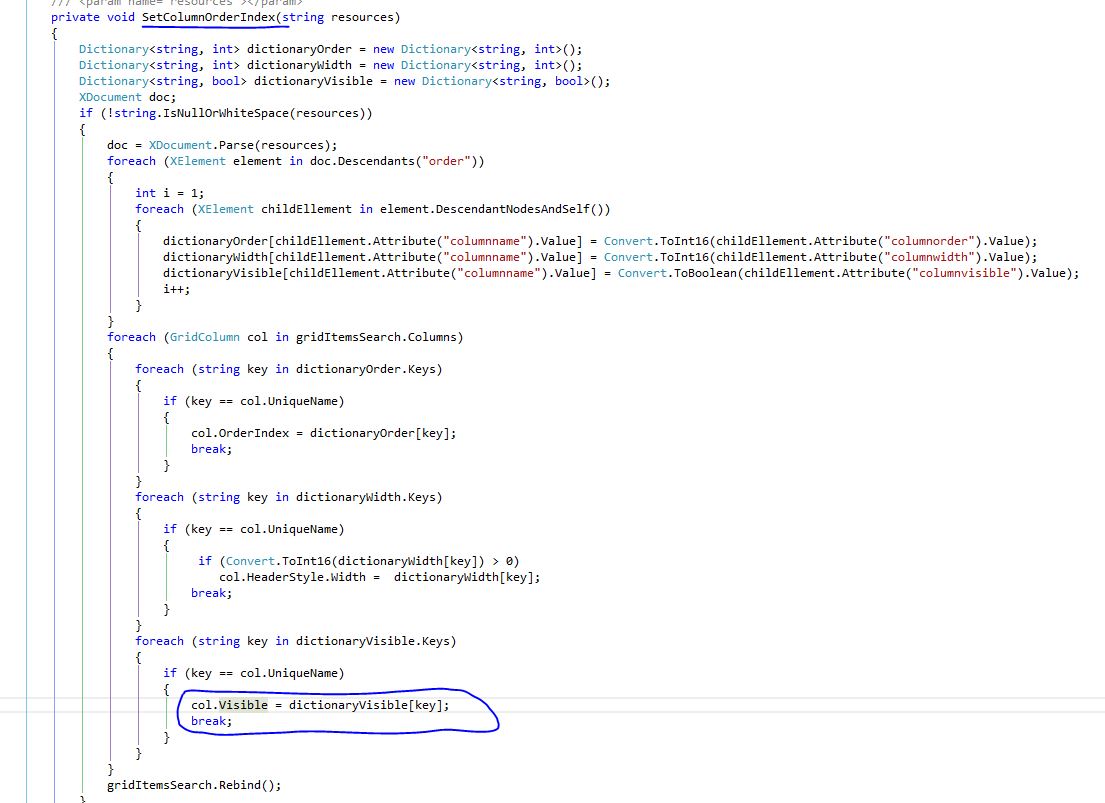My main column assignment logic is at server side and if I uses column.display=true then getting JS error (mentioned in previous post) while checking columns in context menu to include them back in grid. Below is the code snippet. In below code behind function, assigning column order-index, width and hidden columns preferences based on users and saved in database.