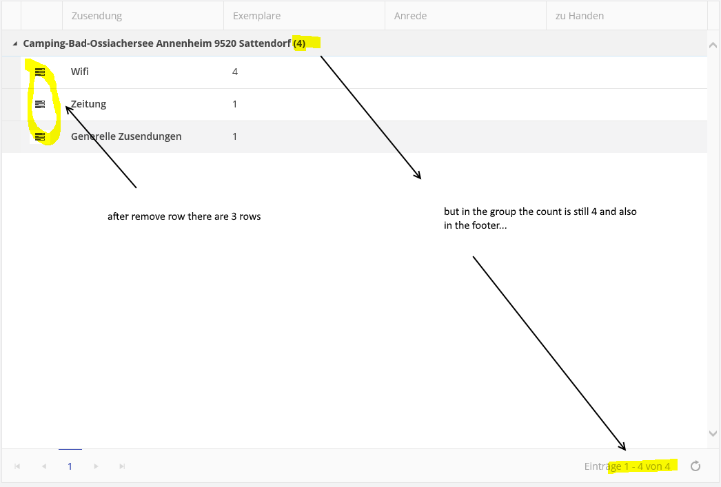 If I use the following code to remove a row in the grid and the grid has Aggregates/Groups this Aggregates and groups are not refreshed...