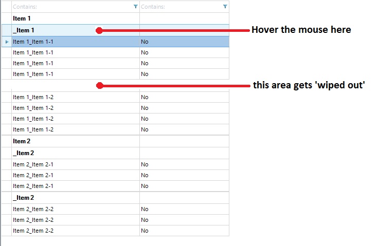 When I hover the mouse over an item higher in the hierarchy, the blank space reappears and overwrites data in the grid (see attached Image04).