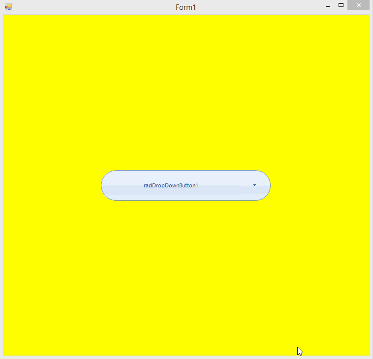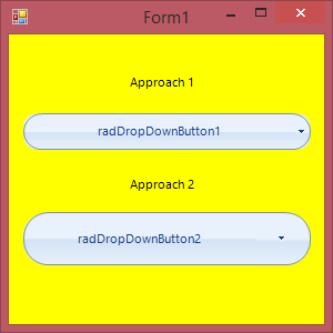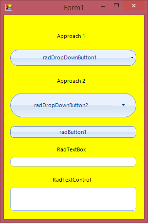 public partial class Form1 : Form{ public Form1() { InitializeComponent(); this.BackColor = Color.Yellow; this.Load += Form1_Load; } private void Form1_Load(object sender, EventArgs e) { RoundRectShape actionButtonShape = new RoundRectShape(); actionButtonShape.BottomLeftRounded = true; actionButtonShape.BottomRightRounded = false; actionButtonShape.TopLeftRounded = true; actionButtonShape.TopRightRounded = false; actionButtonShape.Radius = this.radDropDownButton2.DropDownButtonElement.ActionButton.Size.Height / 2; this.radDropDownButton2.DropDownButtonElement.ActionButton.Shape = actionButtonShape; this.radDropDownButton2.DropDownButtonElement.ArrowButton.MinSize = new Size(this.radDropDownButton2.DropDownButtonElement.Size.Height, 0); RoundRectShape arrowButtonShape = new RoundRectShape(); arrowButtonShape.BottomLeftRounded = false; arrowButtonShape.BottomRightRounded = true; arrowButtonShape.TopLeftRounded = false; arrowButtonShape.TopRightRounded = true; arrowButtonShape.Radius = this.radDropDownButton2.DropDownButtonElement.ArrowButton.Size.Height / 2; this.radDropDownButton2.DropDownButtonElement.ArrowButton.Shape = arrowButtonShape; RoundRectShape shape = new RoundRectShape(); shape.BottomLeftRounded = true; shape.BottomRightRounded = true; shape.TopLeftRounded = true; shape.TopRightRounded = true; shape.Radius = this.radDropDownButton2.DropDownButtonElement.BorderElement.Size.Height / 2; this.radDropDownButton2.DropDownButtonElement.BorderElement.Shape = shape; int radius = 7; RoundRectShape newShape = new RoundRectShape(); newShape.BottomLeftRounded = true; newShape.BottomRightRounded = true; newShape.TopLeftRounded = true; newShape.TopRightRounded = true; newShape.Radius = radius; this.radTextBoxControl1.TextBoxElement.Shape = newShape; this.radTextBox1.TextBoxElement.Shape = newShape; this.radButton1.ButtonElement.Shape = newShape; }}I am also sending you a screenshot showing how the different controls look on my end.