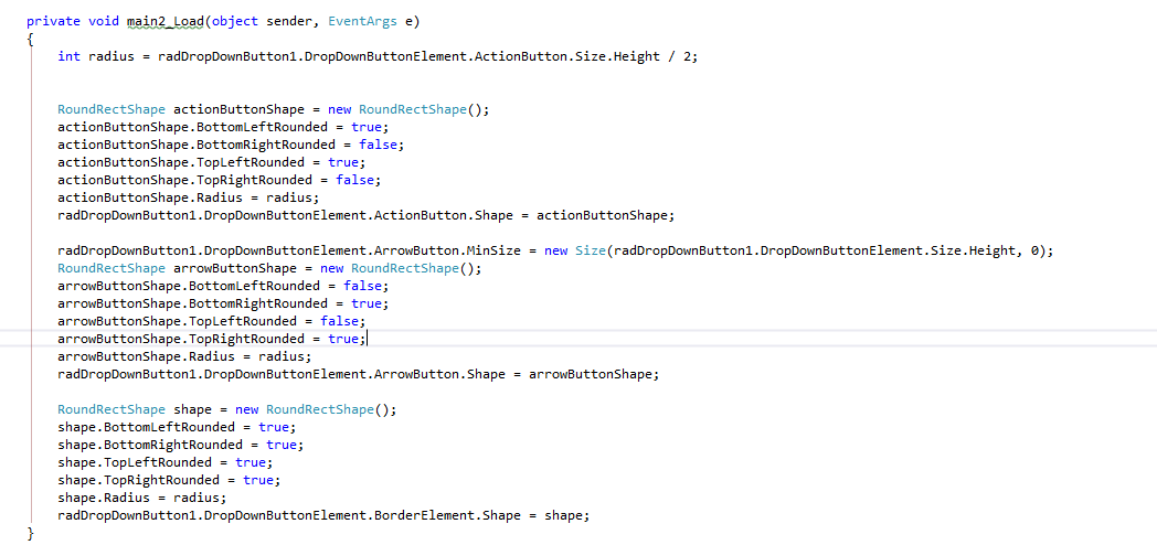 The reason why my example might have not worked for you exactly the way it has been is because the radius which we need to set is related to the actual height of the element. This height is also related to the MinSize.Width which we set for the ArrowButton. In order for all this to work we need to move our logic in the Load event of the form and in the handler set the radius and minimum size according to the actual size of the DropDownButtonElement.