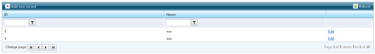 <telerik:RadGrid ID="RadGrid1" runat="server" AutoGenerateColumns="false" OnNeedDataSource="RadGrid1_NeedDataSource" AllowFilteringByColumn="true" AllowMultiRowEdit="true" AllowMultiRowSelection="true" PageSize="2" AllowPaging="true"> <MasterTableView CommandItemDisplay="Top"> <Columns> <telerik:GridBoundColumn DataField="ID" UniqueName="ID" HeaderText="ID"> </telerik:GridBoundColumn> <telerik:GridBoundColumn DataField="Name" UniqueName="Name" HeaderText="Name"> </telerik:GridBoundColumn> <telerik:GridEditCommandColumn> </telerik:GridEditCommandColumn> </Columns> </MasterTableView> <PagerStyle Mode="NextPrev" /> </telerik:RadGrid>protected void RadGrid1_NeedDataSource(object sender, GridNeedDataSourceEventArgs e) { dynamic data = new[] { new { ID = 1, Name ="aaa"}, new { ID = 2, Name = "bbb"}, new { ID = 3, Name = "ccc"}, new { ID = 4, Name = "ddd"}, new { ID = 5, Name ="eee"}, new { ID = 6, Name ="aaa"}, new { ID = 7, Name = "bbb"}, new { ID = 8, Name = "ccc"}, new { ID = 9, Name = "ddd"}, new { ID = 10, Name ="eee"} }; RadGrid1.DataSource = data; }then also you can hide this numeric numbers by using below code snippet.
