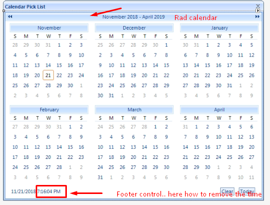 Thank you so much. but am only using the rad calendar control. here am not able to give the condition like this. is there any other possibility to remove the time from status bar footer control. I attach the image for your reference.