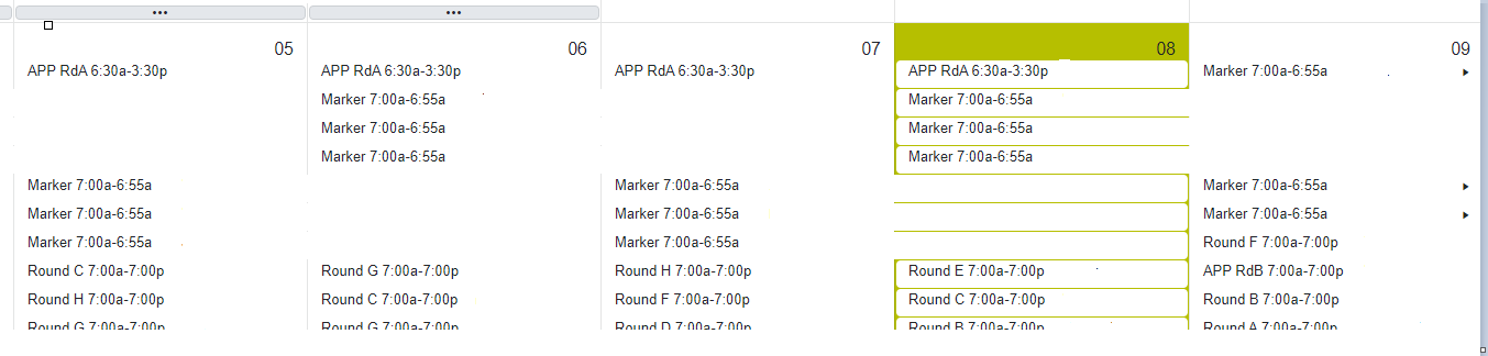 The gap I am talking about is if you look at the 5th. You will see we have one row (shift) then 3-4 blank rows, and then the rest of the shifts. On the 6th. We have 4 rows, then 4 blanks, and then the rest of the shifts.