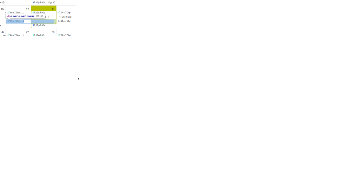 In this case, I can suggest considering another color for the event, so that overnight shifts are distinguishable from the background. The Scheduler will display the events spanning over more than one day in cells for the day when the event is occurring, as seen in the updated example here. You can consider using an eventTemplate and if the event is longer than 24h set a different color for the event. We have an article demonstrating the approach here: