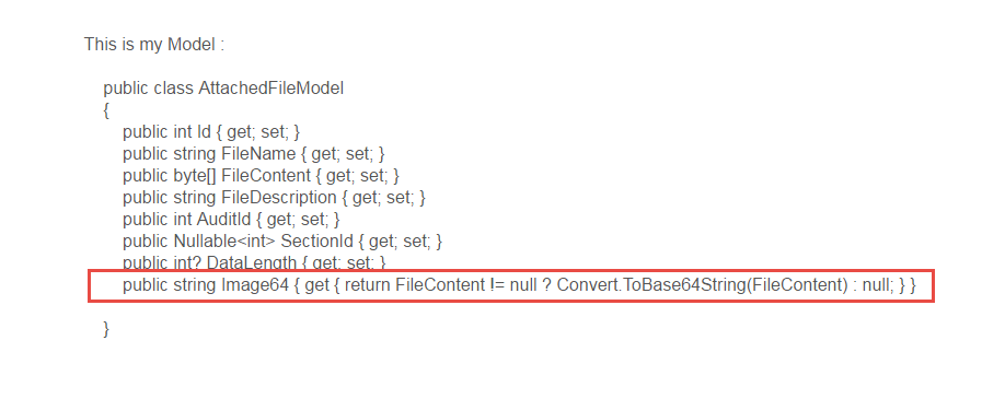public string Image64 { get { return FileContent != null ? Convert.ToBase64String(FileContent) : null; } }