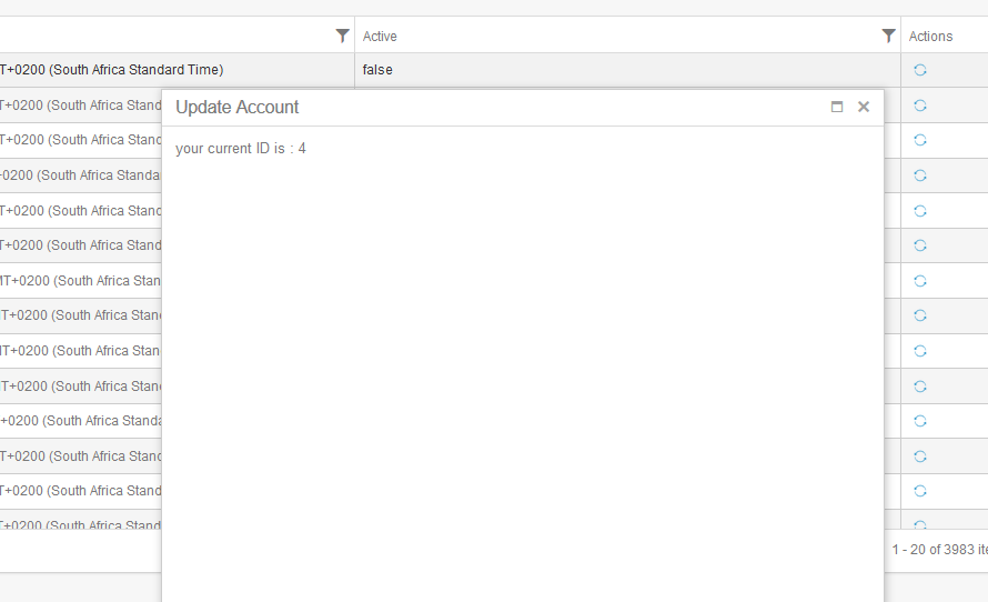 function update(Id) { $("#window").data("kendoWindow") .center() .title('Update Account') .content("your current ID is : "+ Id) // .LoadContentFrom("Test", "Setting") .open();}