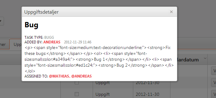 <script type="text/x-kendo-template" id="template"> <div id="details-container"> <h2>#= Title #</h3><br/> <h3><span>Task type: </span>#= TaskType #</h3> <h3><span>Added by: </span><strong> #= AddedByUserName # </strong>