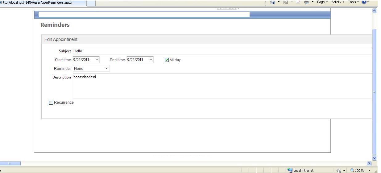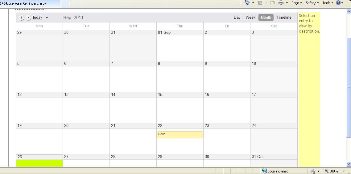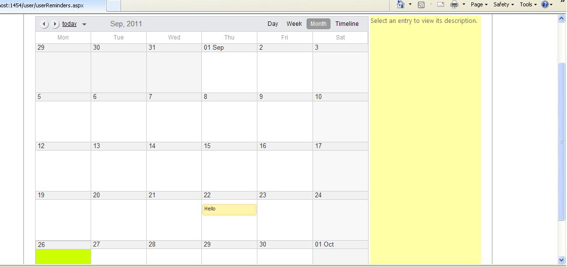 <table width="100%"> <tr> <td width="75%"> <telerik:RadScheduler ID="RadScheduler1" runat="server" DataDescriptionField="Description" DataEndField="EndTime" DataKeyField="keyid" DataRecurrenceField="Recurrence" DataRecurrenceParentKeyField="RecurrenceParentKey" DataReminderField="Reminders" DataSourceID="SqlDataSource1" DataStartField="StartTime" DataSubjectField="Subject" EnableDescriptionField="True" FirstDayOfWeek="Monday" SelectedView="MonthView" Skin="Sitefinity" OverflowBehavior="Expand" EnableCustomAttributeEditing="False" onappointmentinsert="RadScheduler1_AppointmentInsert" StartEditingInAdvancedForm="False" onload="RadScheduler1_Load" > <Reminders Enabled="True" /> </telerik:RadScheduler> </td> <td width="25%" valign="top" bgcolor="#FFFFA6" > <asp:Label ID="RadTextBox1" Runat="server" Text="Select an entry to view its description." ></asp:Label> </td> </tr> <tr> <td> </td> <td> </td> </tr> </table>This is the simple layout, a table with 2 columns and 1st column has RadScheduler. Inspite of simple layout, it does not render properly on screen.