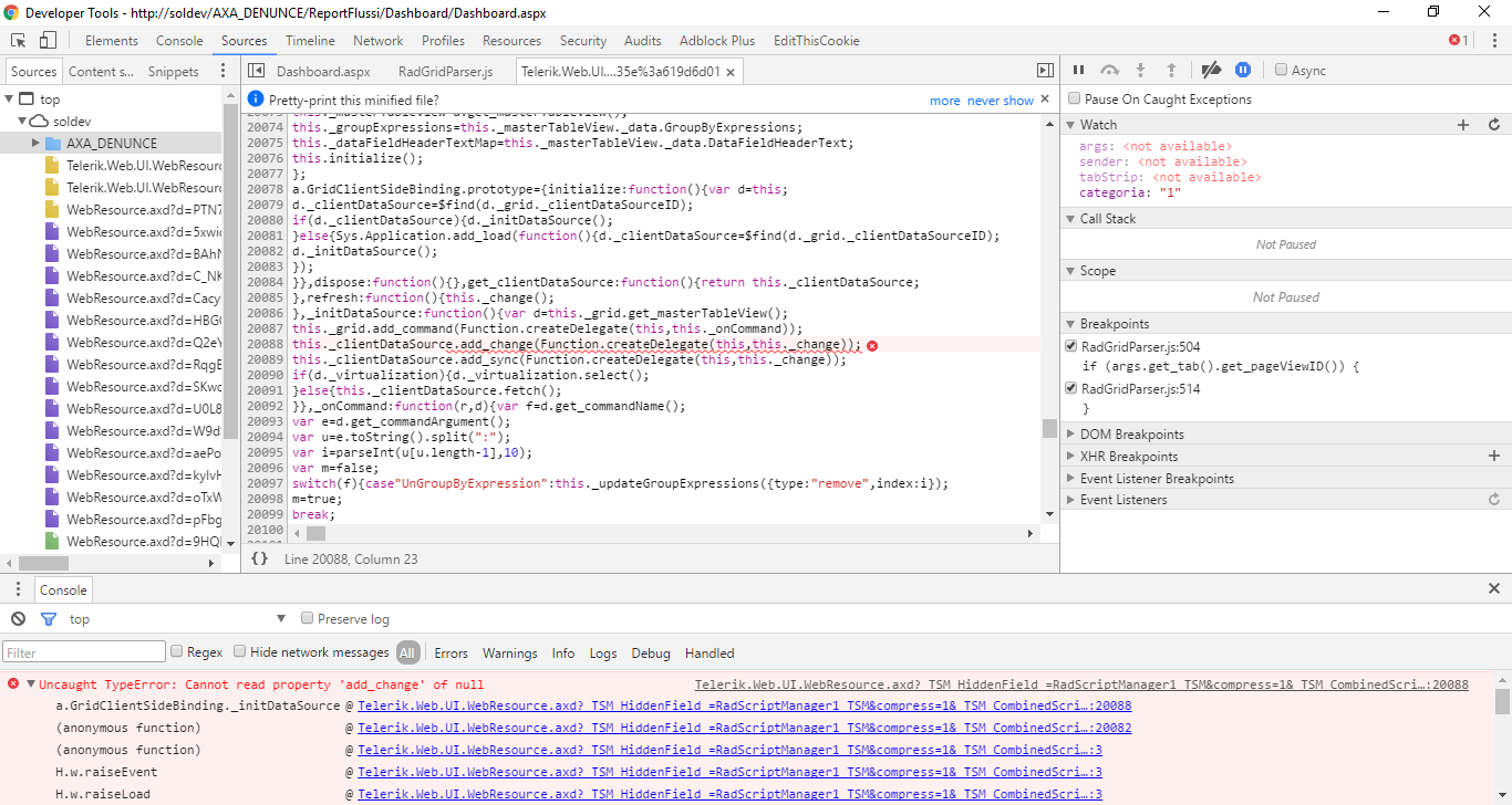 After viewing the first tab, I click on a second tab: everything goes well, the binding of my RadGrid is successful, all calls to JavaScript functions occurring successfully, the call to my web service is done ... everything ok. But at the end of the procedure it raises an exception that blocks the functioning of the entire page (see the attachment).