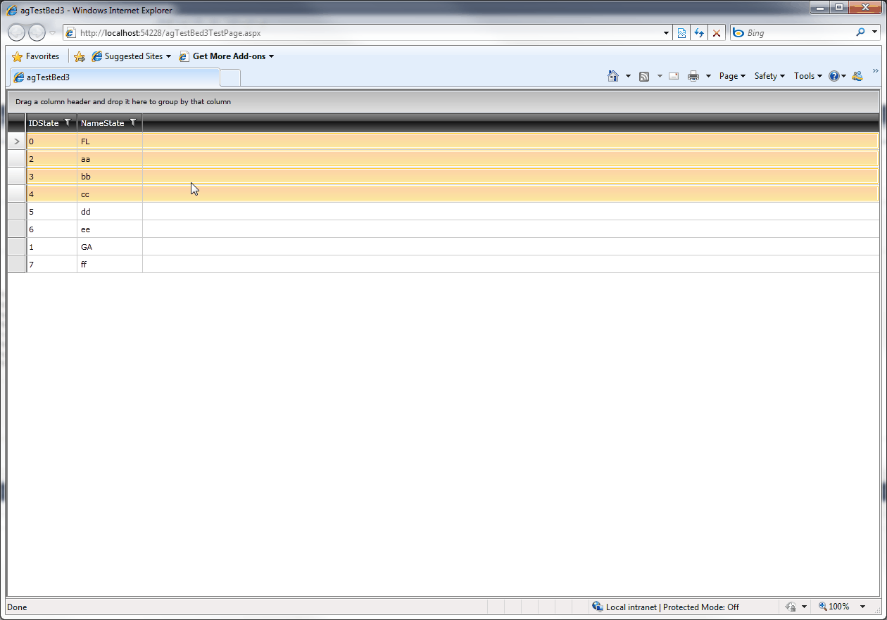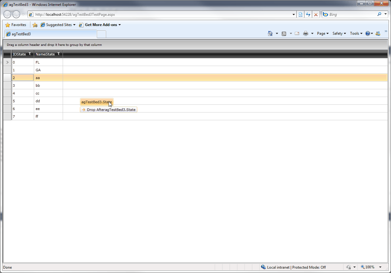 <UserControl x:Class="agTestBed3.MainPage" xmlns:dragAndDrop="clr-namespace:Telerik.Windows.Controls.DragDrop;assembly=Telerik.Windows.Controls" xmlns:d="http://schemas.microsoft.com/expression/blend/2008" xmlns:mc="http://schemas.openxmlformats.org/markup-compatibility/2006" mc:Ignorable="d" d:DesignWidth="640" d:DesignHeight="480" xmlns:telerik="http://schemas.telerik.com/2008/xaml/presentation"> <Grid x:Name="LayoutRoot" > <telerik:RadGridView Name="RadGridView1" SelectionMode="Extended" dragAndDrop:RadDragAndDropManager.AllowDrop="True" /> </Grid> </UserControl> Imports System.Windows.Data Imports Telerik.Windows.Controls Imports Telerik.Windows.Data Imports System.ComponentModel Imports System.Collections.ObjectModel Imports System.Runtime.CompilerServices Partial Public Class MainPage Inherits UserControl Public collStates As New ObservableCollection(Of State) Public Sub New() InitializeComponent() collStates.Add(New State With {.IDState = "0", .NameState = "FL"}) collStates.Add(New State With {.IDState = "1", .NameState = "GA"}) collStates.Add(New State With {.IDState = "2", .NameState = "aa"}) collStates.Add(New State With {.IDState = "3", .NameState = "bb"}) collStates.Add(New State With {.IDState = "4", .NameState = "cc"}) collStates.Add(New State With {.IDState = "5", .NameState = "dd"}) collStates.Add(New State With {.IDState = "6", .NameState = "ee"}) collStates.Add(New State With {.IDState = "7", .NameState = "ff"}) RowReorderBehavior.SetIsEnabled(RadGridView1, True) RadGridView1.ItemsSource = collStates End Sub End Class Public Class State Implements INotifyPropertyChanged Public Event PropertyChanged(ByVal sender As Object, ByVal e As System.ComponentModel.PropertyChangedEventArgs) Implements System.ComponentModel.INotifyPropertyChanged.PropertyChanged Private Sub FirePropertyChanged(ByVal [property] As String) If Not String.IsNullOrEmpty([property]) Then RaiseEvent PropertyChanged(Me, New PropertyChangedEventArgs([property])) End If End Sub Public Property IDState() As String Get Return _IDState End Get Set(ByVal value As String) _IDState = value FirePropertyChanged("IDState") End Set End Property Protected _IDState As String Public Property NameState() As String Get Return _NameState End Get Set(ByVal value As String) _NameState = value FirePropertyChanged("NameState") End Set End Property Protected _NameState As String End Class