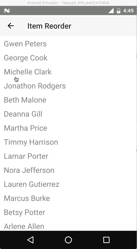 <RadListView row="1" [items]="listItems" borderWidth=".5" selectionBehavior="Press" (itemTap)="selectItem($event.index)" itemReorder="true" (itemReordered)="onItemReordered($event)" height="300"> <ng-template tkListItemTemplate let-item="item" let-i="index"> <Label class="nameLabel" [text]="item" [class.highlight]="i===selectedItemIndex" paddingLeft="5" paddingRight="5"></Label> </ng-template></RadListView>