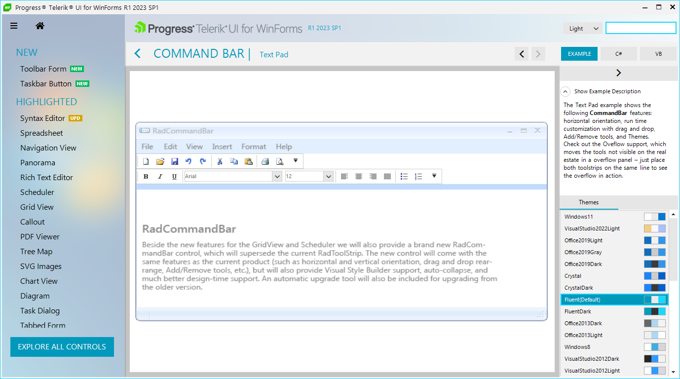 Our Demo application >> CommandBar examples are quite useful about getting started experience with RadCommandBar. It is located In the installation folder of the suite: