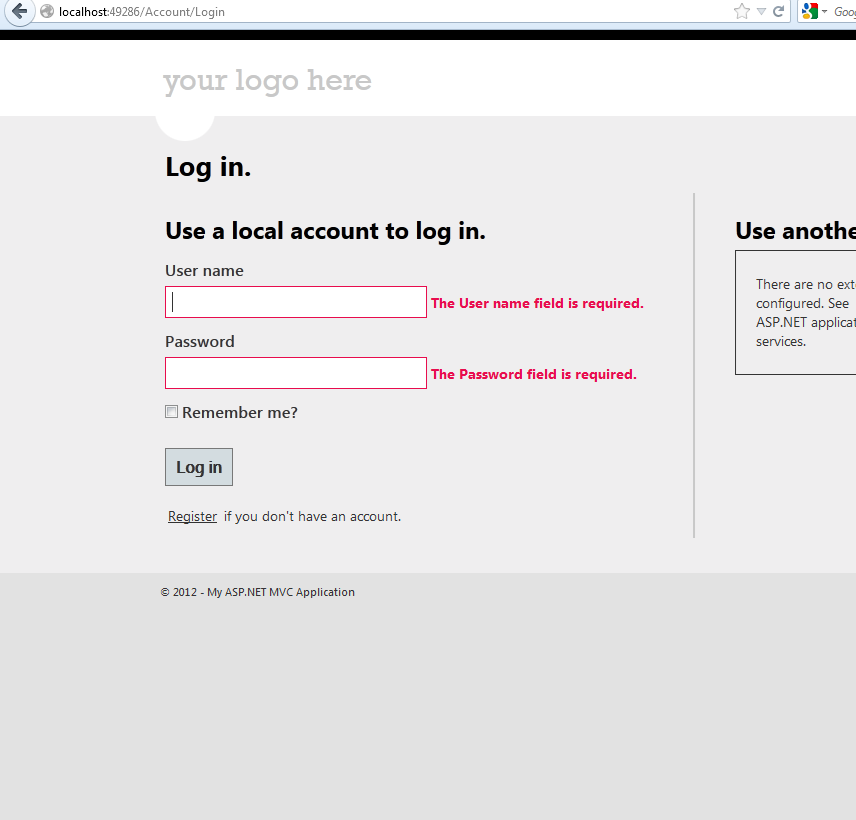 @model MvcApplication1.Models.LoginModel@{ ViewBag.Title = "Log in";}<script type="text/javascript"> $(document).ready(function () { var validator = $("#tickets").kendoValidator().data("kendoValidator"); $("input").click(function (e) { if (!validator.validate()) { e.preventDefault(); } }); });</script><hgroup class="title"> <h1>@ViewBag.Title.</h1></hgroup><section id="loginForm"><h2>Use a local account to log in.</h2><div id="tickets">@using (Html.BeginForm(new { ReturnUrl = ViewBag.ReturnUrl })){ @Html.AntiForgeryToken() @Html.ValidationSummary(true) <fieldset> <legend>Log in Form</legend> <ol> <li> @Html.LabelFor(m => m.UserName) @Html.TextBoxFor(m => m.UserName) @Html.ValidationMessageFor(m => m.UserName) </li> <li> @Html.LabelFor(m => m.Password) @Html.PasswordFor(m => m.Password) @Html.ValidationMessageFor(m => m.Password) </li> <li> @Html.CheckBoxFor(m => m.RememberMe) @Html.LabelFor(m => m.RememberMe, new { @class = "checkbox" }) </li> </ol> <input type="submit" value="Log in" /> </fieldset> <p> @Html.ActionLink("Register", "Register") if you don't have an account. </p>}</div></section><section class="social" id="socialLoginForm"> <h2>Use another service to log in.</h2> @Html.Action("ExternalLoginsList", new { ReturnUrl = ViewBag.ReturnUrl })</section>@section Scripts { @Scripts.Render("~/bundles/jqueryval")}Please check below screen shot.