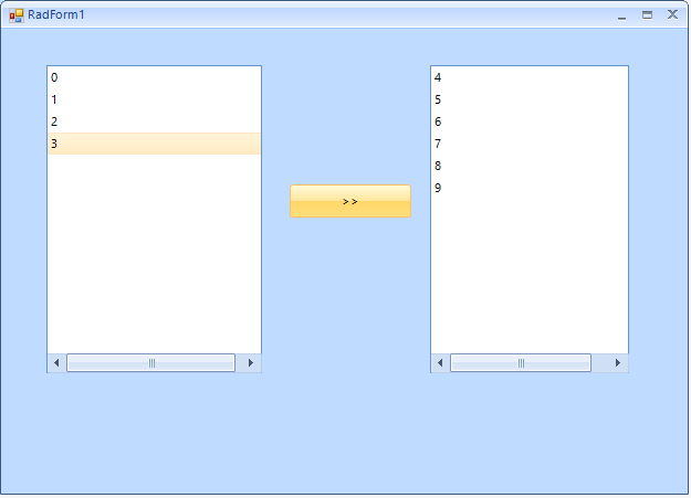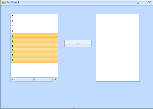 I am attempting to move multiple selected items between Telerik ListView controls. If I was doing this with a Winforms Listbox, it would look like this: