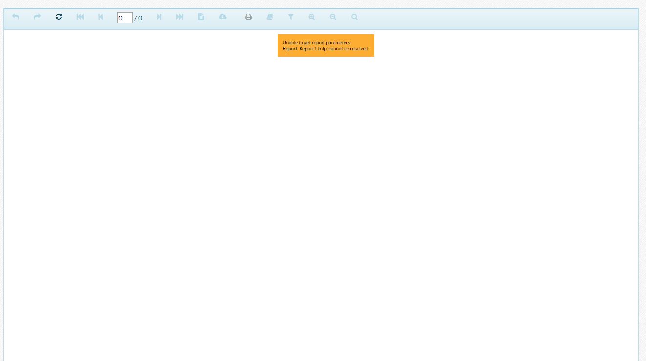 My View<style> #reportViewer1 { position: relative; width: 1300px; height: 900px; } </style>@(Html.TelerikReporting().ReportViewer() .Id("reportViewer1") .ServiceUrl(Url.Content("/api/reports/")) .TemplateUrl("/Resources/Templates/telerikReportViewerTemplate.html") .ReportSource(new UriReportSource() { Uri = "Report1.trdp" }) .ViewMode(ViewMode.Interactive) .ScaleMode(ScaleMode.Specific) .Scale(1.0) .PersistSession(false) .PrintMode(PrintMode.AutoSelect))My controllernamespace OvalWeb.Controllers{ using System.IO; using System.Web; using Telerik.Reporting.Cache.File; using Telerik.Reporting.Services; using Telerik.Reporting.Services.Engine; using Telerik.Reporting.Services.WebApi; //The class name determines the service URL. //ReportsController class name defines /api/report/ service URL. public class ReportsController : ReportsControllerBase { static ReportServiceConfiguration preservedConfiguration; static IReportServiceConfiguration PreservedConfiguration { get { if (null == preservedConfiguration) { preservedConfiguration = new ReportServiceConfiguration { HostAppId = "OvalWebReport", Storage = new FileStorage("C:/Storage"), ReportResolver = CreateResolver(), // ReportSharingTimeout = 0, // ClientSessionTimeout = 15, }; } return preservedConfiguration; } } public ReportsController() { this.ReportServiceConfiguration = PreservedConfiguration; } static IReportResolver CreateResolver() { var appPath = HttpContext.Current.Server.MapPath("~/"); var reportsPath = Path.Combine(appPath, @"Report\Designs\Ventas\Tickets\Familia"); return new ReportFileResolver(reportsPath) .AddFallbackResolver(new ReportTypeResolver()); } }}