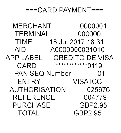 " ===CARD PAYMENT===\r\n\r\nMERCHANT 0000001\r\nTERMINAL 0000001\r\nTIME 18 Jul 2017 18:31\r\nAID A0000000031010\r\nAPP LABEL CREDITO DE VISA\r\nCARD ************0119\r\nPAN SEQ Number 01\r\nENTRY VISA ICC\r\nAUTHORISATION 025976\r\nREFERENCE 004779\r\nPURCHASE GBP2.95\r\nTOTAL GBP2.95\r\n \r\n"
