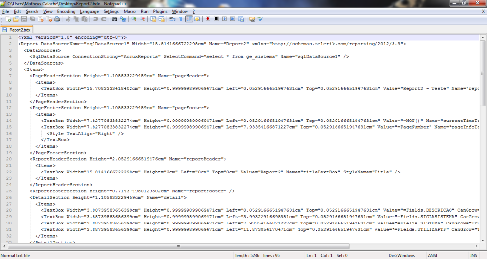 Source=Telerik.Reporting". Mine ended with "...name : Report". After I had tussled for two hours, I opened my new report's ".trdx" file and checked the 'xmlns' part in the second in the '.trdx' file. The old ones have different version number.