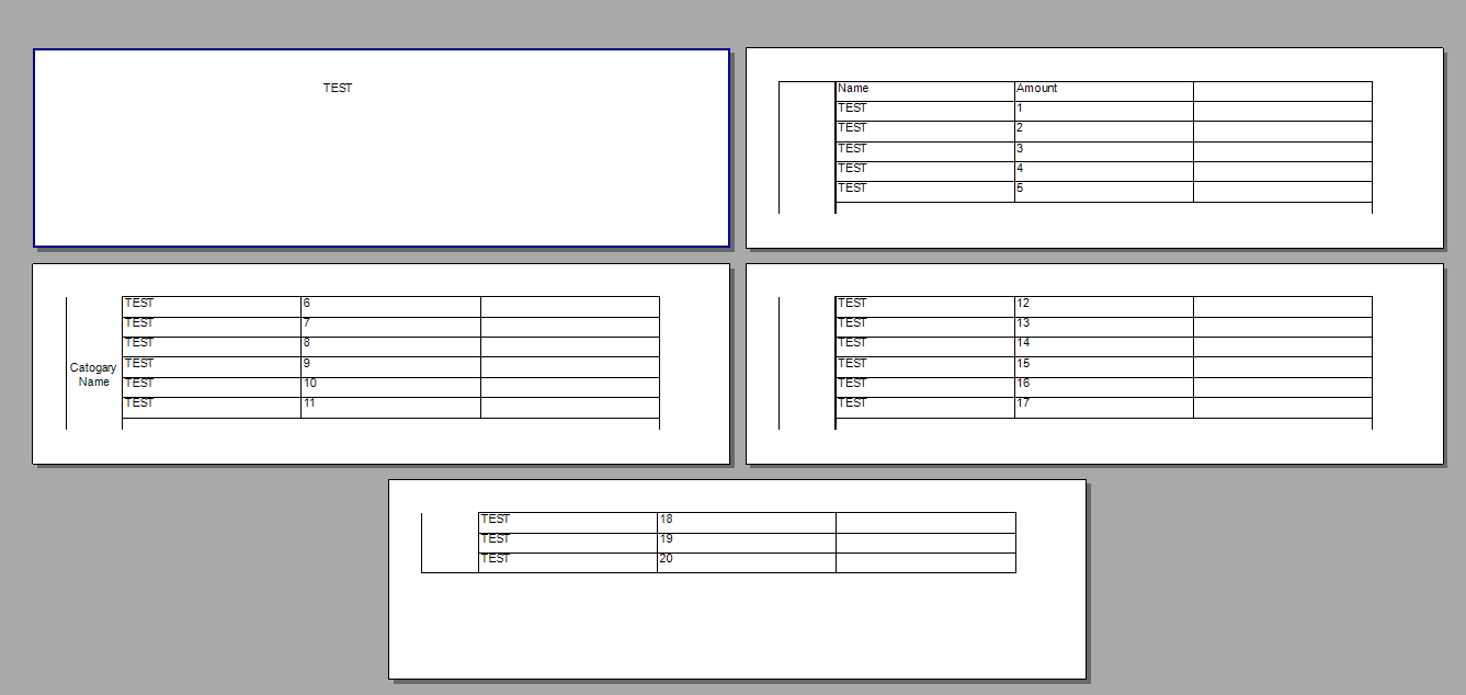 <?xml version="1.0" encoding="utf-8"?><Report Width="18.1cm" Name="Report1" xmlns="http://schemas.telerik.com/reporting/2020/1.0"> <DataSources> <JsonDataSource Name="jsonDataSource1"> <Source> <String>Ww0KeyJOYW1lIjoiVEVTVCIsICJBbW91bnQiOiAxfSwNCnsiTmFtZSI6IlRFU1QiLCAiQW1vdW50IjogMn0sDQp7Ik5hbWUiOiJURVNUIiwgIkFtb3VudCI6IDN9LA0KeyJOYW1lIjoiVEVTVCIsICJBbW91bnQiOiA0fSwNCnsiTmFtZSI6IlRFU1QiLCAiQW1vdW50IjogNX0sDQp7Ik5hbWUiOiJURVNUIiwgIkFtb3VudCI6IDZ9LA0KeyJOYW1lIjoiVEVTVCIsICJBbW91bnQiOiA3fSwNCnsiTmFtZSI6IlRFU1QiLCAiQW1vdW50IjogOH0sDQp7Ik5hbWUiOiJURVNUIiwgIkFtb3VudCI6IDl9LA0KeyJOYW1lIjoiVEVTVCIsICJBbW91bnQiOiAxMH0sDQp7Ik5hbWUiOiJURVNUIiwgIkFtb3VudCI6IDExfSwNCnsiTmFtZSI6IlRFU1QiLCAiQW1vdW50IjogMTJ9LA0KeyJOYW1lIjoiVEVTVCIsICJBbW91bnQiOiAxM30sDQp7Ik5hbWUiOiJURVNUIiwgIkFtb3VudCI6IDE0fSwNCnsiTmFtZSI6IlRFU1QiLCAiQW1vdW50IjogMTV9LA0KeyJOYW1lIjoiVEVTVCIsICJBbW91bnQiOiAxNn0sDQp7Ik5hbWUiOiJURVNUIiwgIkFtb3VudCI6IDE3fSwNCnsiTmFtZSI6IlRFU1QiLCAiQW1vdW50IjogMTh9LA0KeyJOYW1lIjoiVEVTVCIsICJBbW91bnQiOiAxOX0sDQp7Ik5hbWUiOiJURVNUIiwgIkFtb3VudCI6IDIwfQ0KXQ==</String> </Source> </JsonDataSource> </DataSources> <Items> <DetailSection KeepTogether="False" Height="1.217cm" Name="detailSection1"> <Items> <List Width="17.905cm" Height="1.217cm" Left="0cm" Top="0cm" KeepTogether="False" Name="list1"> <Body> <Cells> <TableCell RowIndex="0" ColumnIndex="1" RowSpan="1" ColumnSpan="1"> <ReportItem> <Panel Width="16.2cm" Height="1.217cm" Left="0cm" Top="0cm" KeepTogether="False" Name="panel1"> <Items> <Table DataSourceName="jsonDataSource1" Width="16.2cm" Height="1.217cm" Left="0cm" Top="0cm" KeepTogether="False" Name="table1"> <Body> <Cells> <TableCell RowIndex="0" ColumnIndex="2" RowSpan="1" ColumnSpan="1"> <ReportItem> <TextBox Width="5.4cm" Height="0.608cm" Left="0cm" Top="0cm" Name="textBox6"> <Style> <BorderStyle Top="Solid" Bottom="Solid" Left="Solid" Right="Solid" /> <BorderColor Top="Black" Bottom="Black" Left="Black" Right="Black" /> <BorderWidth Top="1pt" Bottom="1pt" Left="1pt" Right="1pt" /> </Style> </TextBox> </ReportItem> </TableCell> <TableCell RowIndex="0" ColumnIndex="0" RowSpan="1" ColumnSpan="1"> <ReportItem> <TextBox Width="5.4cm" Height="0.608cm" Left="8.095cm" Top="0.6cm" Value="= Fields.Name" Name="textBox8" StyleName=""> <Style> <BorderStyle Top="Solid" Bottom="Solid" Left="Solid" Right="Solid" /> </Style> </TextBox> </ReportItem> </TableCell> <TableCell RowIndex="0" ColumnIndex="1" RowSpan="1" ColumnSpan="1"> <ReportItem> <TextBox Width="5.4cm" Height="0.608cm" Left="8.095cm" Top="0.6cm" Value="= Fields.Amount" Name="textBox2" StyleName=""> <Style> <BorderStyle Top="Solid" Bottom="Solid" Left="Solid" Right="Solid" /> </Style> </TextBox> </ReportItem> </TableCell> </Cells> <Columns> <Column Width="5.4cm" /> <Column Width="5.4cm" /> <Column Width="5.4cm" /> </Columns> <Rows> <Row Height="0.608cm" /> </Rows> </Body> <Corner /> <Style Visible="True"> <BorderStyle Top="Solid" Bottom="Solid" Left="Solid" Right="Solid" /> <BorderColor Top="Black" Bottom="Black" Left="Black" Right="Black" /> <BorderWidth Top="1pt" Bottom="1pt" Left="1pt" Right="1pt" /> </Style> <RowGroups> <TableGroup Name="detailTableGroup"> <Groupings> <Grouping /> </Groupings> </TableGroup> </RowGroups> <ColumnGroups> <TableGroup Name="tableGroup"> <ReportItem> <TextBox Width="5.4cm" Height="0.609cm" Left="0cm" Top="0cm" Value="Name" Name="textBox1"> <Style> <BorderStyle Top="Solid" Bottom="Solid" Left="Solid" Right="Solid" /> <BorderColor Top="Black" Bottom="Black" Left="Black" Right="Black" /> <BorderWidth Top="1pt" Bottom="1pt" Left="1pt" Right="1pt" /> </Style> </TextBox> </ReportItem> </TableGroup> <TableGroup Name="tableGroup1"> <ReportItem> <TextBox Width="5.4cm" Height="0.609cm" Left="0cm" Top="0cm" Value="Amount" Name="textBox3"> <Style> <BorderStyle Top="Solid" Bottom="Solid" Left="Solid" Right="Solid" /> <BorderColor Top="Black" Bottom="Black" Left="Black" Right="Black" /> <BorderWidth Top="1pt" Bottom="1pt" Left="1pt" Right="1pt" /> </Style> </TextBox> </ReportItem> </TableGroup> <TableGroup Name="tableGroup2"> <ReportItem> <TextBox Width="5.4cm" Height="0.609cm" Left="0cm" Top="0cm" Name="textBox5"> <Style> <BorderStyle Top="Solid" Bottom="Solid" Left="Solid" Right="Solid" /> <BorderColor Top="Black" Bottom="Black" Left="Black" Right="Black" /> <BorderWidth Top="1pt" Bottom="1pt" Left="1pt" Right="1pt" /> </Style> </TextBox> </ReportItem> </TableGroup> </ColumnGroups> </Table> </Items> </Panel> </ReportItem> </TableCell> <TableCell RowIndex="0" ColumnIndex="0" RowSpan="1" ColumnSpan="1"> <ReportItem> <TextBox Width="1.705cm" Height="1.217cm" Left="0cm" Top="0cm" KeepTogether="False" Value="Catogary Name" Name="textBox7" StyleName=""> <Style TextAlign="Center" VerticalAlign="Middle" /> </TextBox> </ReportItem> </TableCell> </Cells> <Columns> <Column Width="1.705cm" /> <Column Width="16.2cm" /> </Columns> <Rows> <Row Height="1.217cm" /> </Rows> </Body> <Corner /> <Style> <BorderStyle Top="Solid" Bottom="Solid" Left="Solid" Right="Solid" /> <BorderColor Top="Black" Bottom="Black" Left="Black" Right="Black" /> <BorderWidth Top="1pt" Bottom="1pt" Left="1pt" Right="1pt" /> </Style> <RowGroups> <TableGroup Name="DetailGroup"> <Groupings> <Grouping /> </Groupings> </TableGroup> </RowGroups> <ColumnGroups> <TableGroup Name="group" /> <TableGroup Name="ColumnGroup" /> </ColumnGroups> </List> </Items> </DetailSection> <ReportHeaderSection KeepTogether="False" Height="0.5cm" Name="reportHeaderSection1"> <Items> <TextBox Width="3cm" Height="0.5cm" Left="7.7cm" Top="0cm" Value="TEST" Name="textBox14" /> </Items> </ReportHeaderSection> </Items> <PageSettings PaperKind="Custom" PaperSize="210mm, 60mm" Landscape="False" ContinuousPaper="False"> <Margins> <MarginsU Left="1cm" Right="1cm" Top="1cm" Bottom="1cm" /> </Margins> </PageSettings> <StyleSheet> <StyleRule> <Style> <Padding Left="2pt" Right="2pt" /> </Style> <Selectors> <TypeSelector Type="TextItemBase" /> <TypeSelector Type="HtmlTextBox" /> </Selectors> </StyleRule> </StyleSheet></