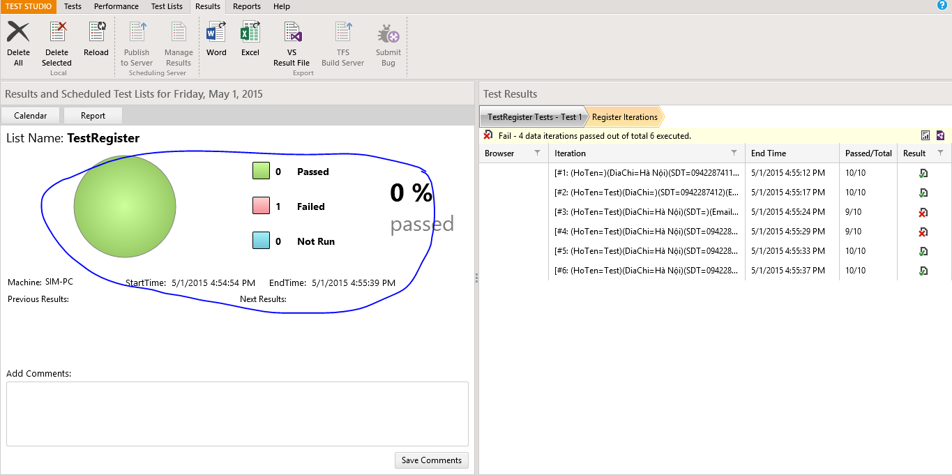 I see in your screen shot that the chart is showing that a total of 0 tests contained in the test list passed, and 1 test in the test list failed. How many tests were in your test list, just one? If true then the display is correct. I see in the right pane that your one test ran a total of 6 iterations, some passed and some failed (interations 1, 2, 5, 6 passed while iterations 3, 4 failed). Test Studio is correctly reporting that the test, as a whole, failed because at least one iteration contained in it failed.