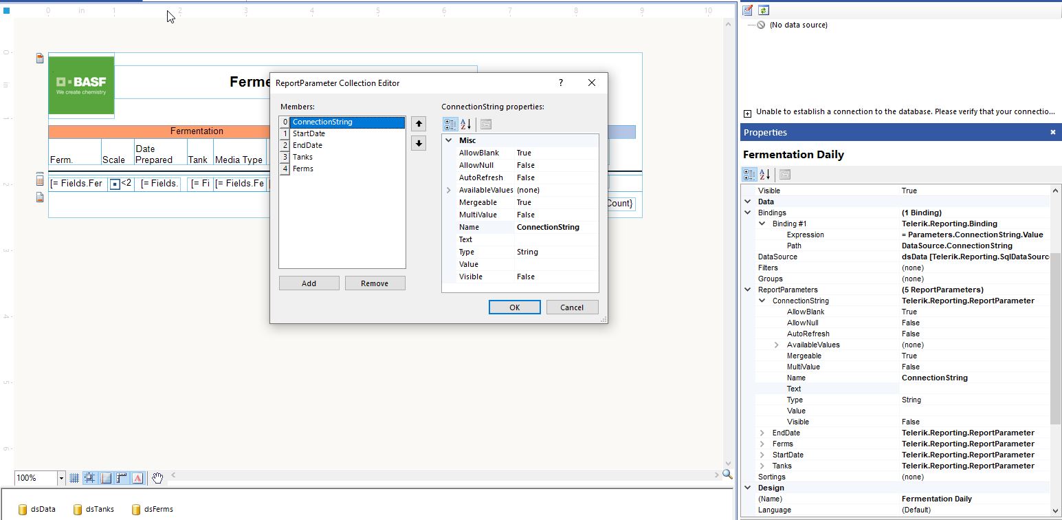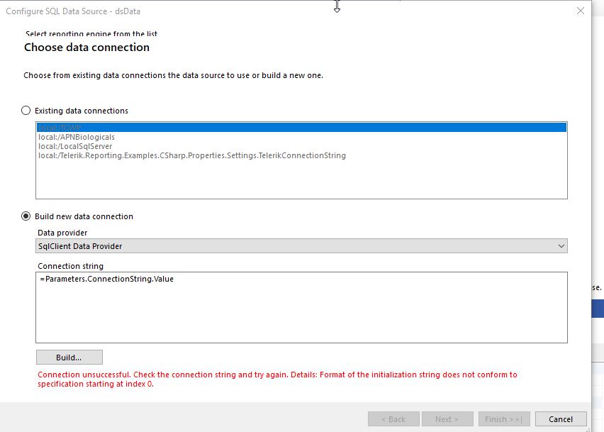 In my trdp I created a new report parameter and assigned it to the connection string field of the Configure data source dialog (See attached screen shot.). I am unable to connect to the db this way. This is in a blazor server environment.