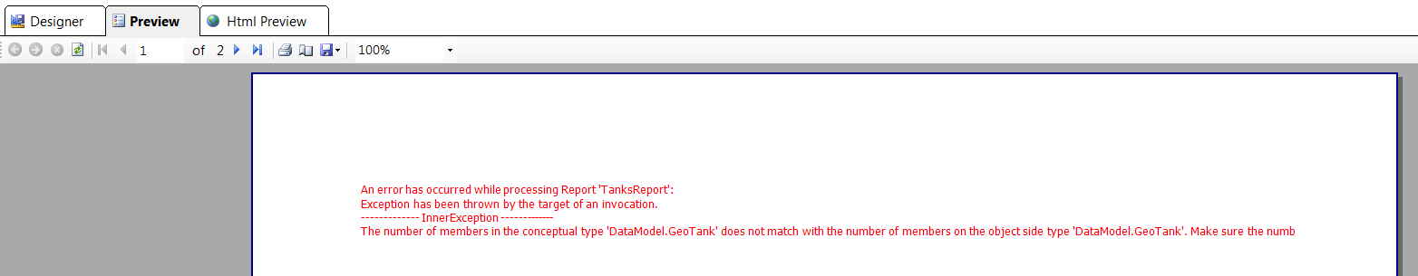 I created a report using an EntityDataSource. Whenever I make a change to the model and rebuild the solution, my report previews no longer work. To get them to work, I have to close Visual Studio and reopen the project. Before restarting Visual Studio, here's the error message I get in the report preview: