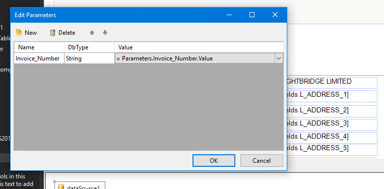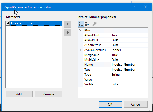 I am using a demo of the reporting software but I am having issues understanding parameters I have set up the parameter Invoice_Number on the report parameters screenshot as per image 1.1. On My menu click of my I have a report viewer with the report with the .