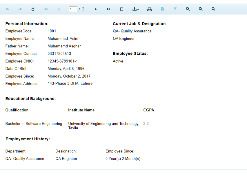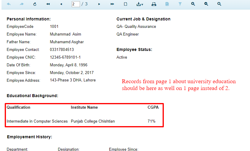 I am working on a report where I want to display employee details along with the educational background like his/her college or university. When I use just table in the detail section to display the employee educational details it shows all records for every employee like it should i.e 2 records for an employee but when I use textbox above the table to show the name, fathername, phone for employee it shows the record on 2 pages one for university and then for college thinking it as 2 different employees though it should move to the second page only when employee is other than this one. I hope you can understand what I want to say.