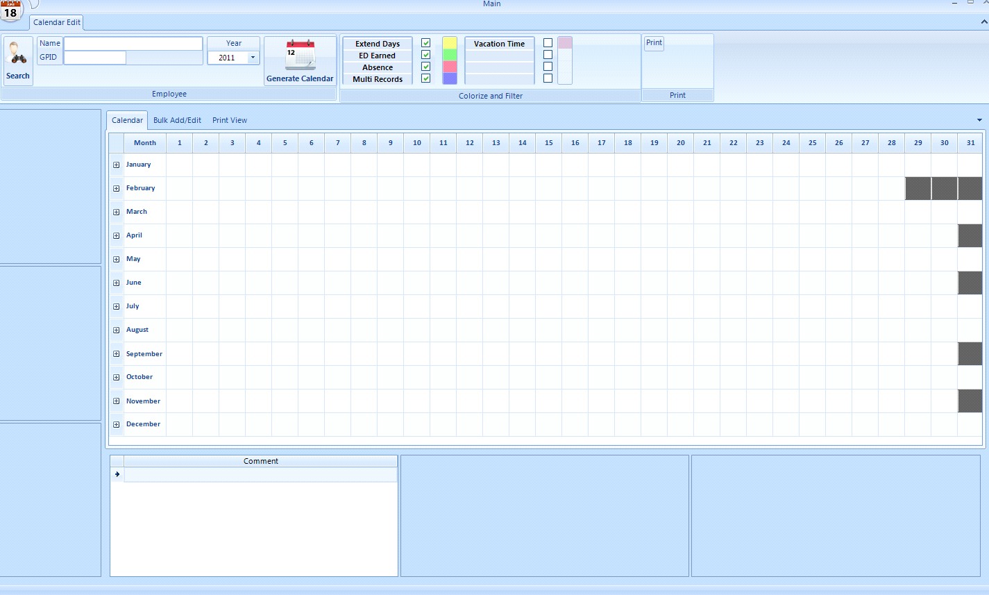 I have created a RadGridView in my application to use as an employee attendance calendar. The datasource is a SQL Server table with 1 column for the name of the month and 31 columns for the days of the month. In the database only the MonthName column has data in it; one record for each month. The columns for the days of the month are empty in the database. Basically this is just a template.