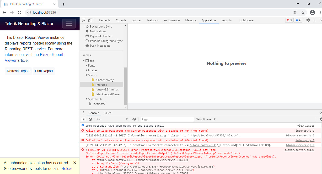 Microsoft.AspNetCore.Components.Server.Circuits.RemoteRenderer: Warning: Unhandled exception rendering component: Could not find 'telerikReportViewerInterop.createReportViewerWidget' ('telerikReportViewerInterop' was undefined).