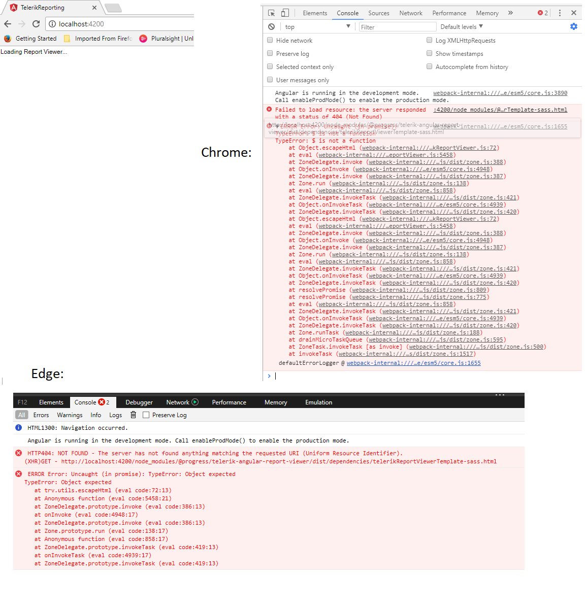 I've been trying to get the demo for Angular CLI working for the last few days. I'm trying the SASS approach and I've noticed that the [templateURL] is consistently running into problems with pulling the telerikReportViewerTemplate-sass.html file in the node_modules/@progress route. I've included both Chrome and Edge errors as the full link shows up better in Edge. I've tried adding ~, ~/, ../, and it seems like anything I try to modify the route and get it working is reversed out by the webpack when I load it.
